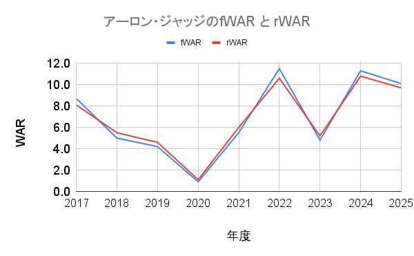 そこでこの記事では、WARの定義やfWARとrWARの違い、メリットと限界を整理したうえでアーロン・ジャッジのシーズン別・通算成績を具体的に解説します。